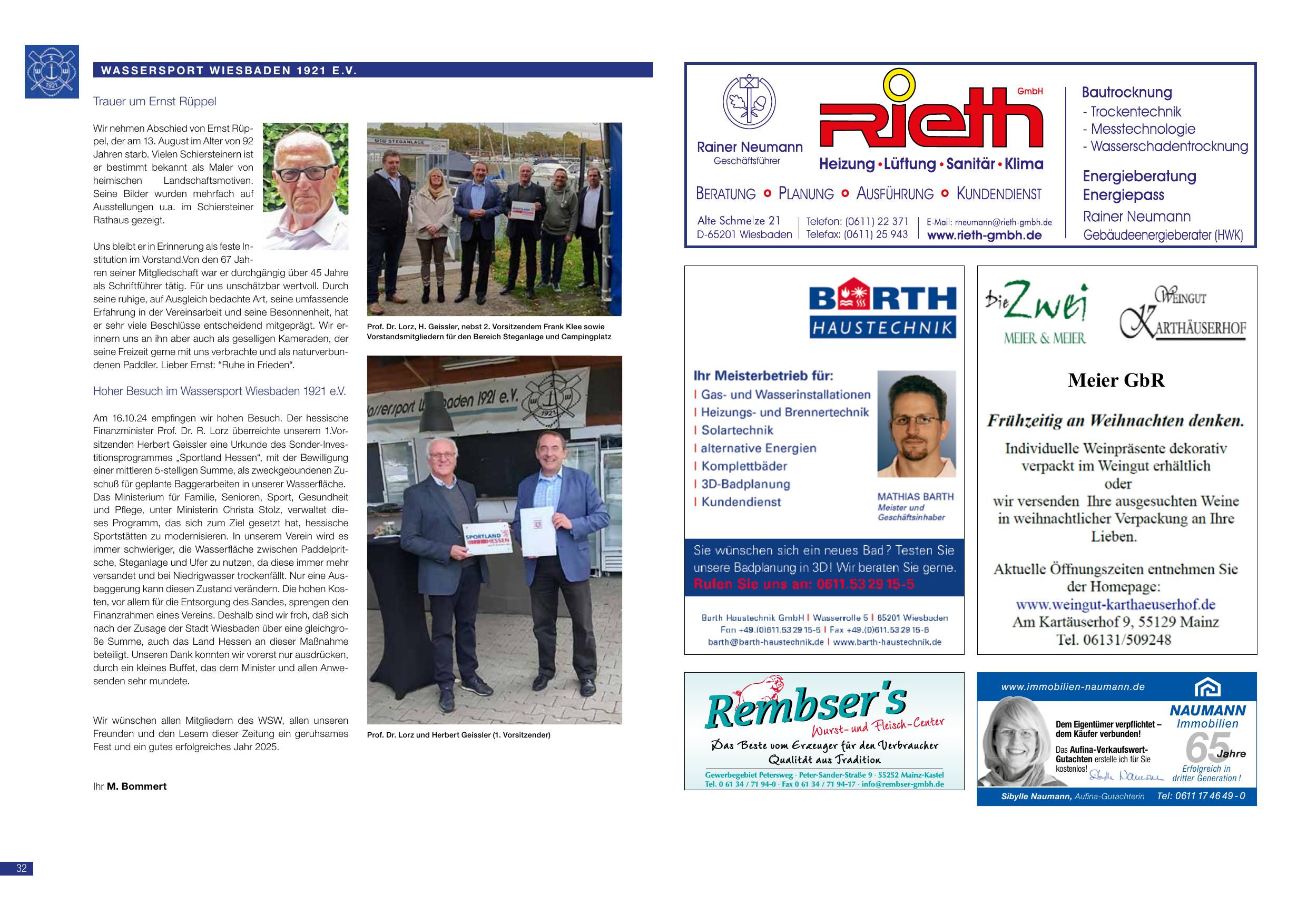 Trauer um Ernst Röppel: Wir nehmen Abschied von Ernst Röppel, der im Alter von 80 Jahren am 15. August im Alter von seinem Vereinsheim verstarb. Seit vielen Jahrzehnten hat er Schiersteinen an dem mäandernden Landschaftsformen der Feuerwehr gesorgt. Das Schiersteiner Friedenslicht sei mit ihm zu Grabe getragen. Ihm bleibt eine Erinnerung als festes Mitglied bei uns bei über 40 Jahre im Schiersteiner Vorstand und seiner einzigartigen Art, umfassende Erfahrung in der Wassersportsbewegung zu teilen. An seiner Seite stand Schriftführer Ernst Ruppl, der mit herzlichem Blick und seiner Schriftführung in der Wassersportsbewegung sich besonders für die Pflege kleiner Grünlands-Projekte einsetzte und dabei sehr freundlich, oft humorvoll und hilfsbereit zur Seite stand. Hoher Besuch: Wassersport Wiesbaden 1921 e.V.: Am 10.10.2024 empfing der Verein einen hohen Besuch: Das hessische Finanzministerium schenkte dem Verein die Originalurkunde des Stiftervereins und der Beitrag der Bewilligung der Stadtrats-Förderprogram des Ministeriums. Wir wünschen allen Mitglieder ein schönes Weihnachten und alles Gute für 2025. M. Bommert.