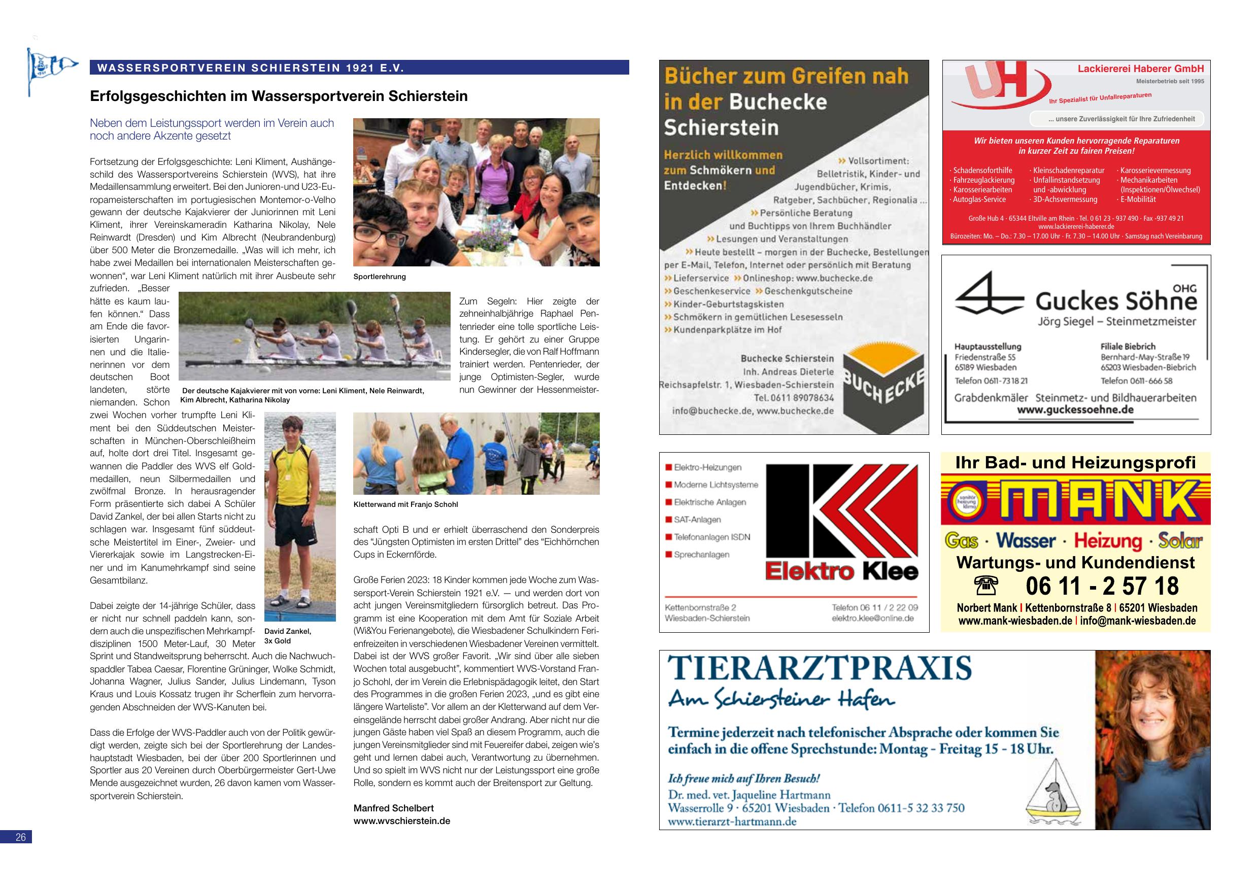 Neben dem Leistungssport können im Verein auch noch andere Aktivitäten genossen werden. Die Erfolgsserie des Schwimmers Leni Klimert setzt sich fort. Der WSV hat die deutsche Kajak-Jünioren Leni Klimert und Kea Albrecht (Randenburg) aus dem eigenen Nachwuchs gewonnen, die seit 2022/23 als Jugend-Nationalmannschaft gemeldet sind. Beim deutschen Jugendmeisterschaften wurden 14 Goldmedaillen, neue Silbermedaillen und neue Bronzemedaillen gewonnen. Beim deutschen Sportfest in München-Oberschleißheim wurden auf dem offenen Start zahlreiche Starter erfolgreich platziert. David Zankel, der bei allen Starts nicht zu schlagen war, präsentierte sein Programm vom Sondervortrag am Halbjahresfest. Bericht von Manfred Scheifert.