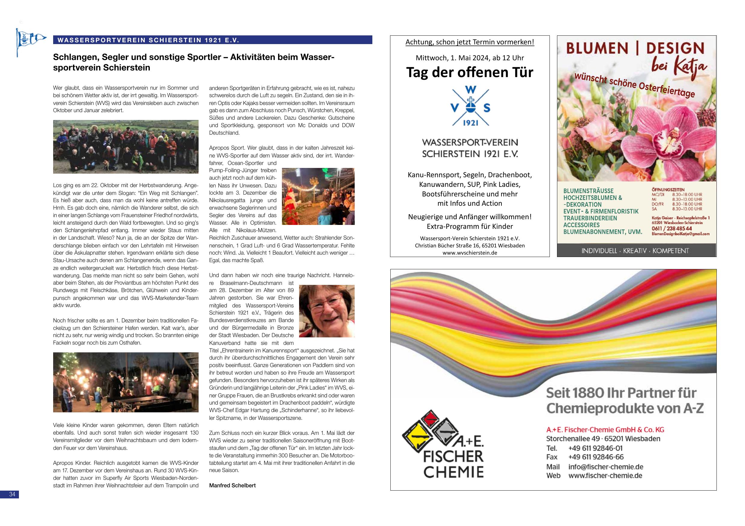 Schlangen, Segler und sonstige Aktivitäten beim Wassersportverein Schierstein. Wir und unsere Mitglieder im Sommer und den schönen Wetterlagen: als wir in Wassersportverein Schierstein (WVS) war das Vereinsleben auch zwischen Oktober und November aktiv. Los ging es am 20. Oktober mit der Herbstaufteilung. Junge Kinder und Interessenten wurden eingeladen. Im Dezember gab es den gemeinsamen Abschluss. Viele Kinder wurden im Rahmen des Weihnachtsmarkts eingebunden. Die Jahresabschluss ist im Dezember gefündet: Es gab einen „Tag an der Rheinstrasse“. Auch ein schönes Kindertag am 28. Dezember von 60 Jahren gegeben. Die Mitgliedschaft WSW ehrt in diesem Jahr mit einem Ehrungspreis jene Mitglieder, die in den 60 Jahren am aktivsten beitragen. Mitglieder: Helmut Söhn-Chef „Schattenmann“ ausgezeichnet für seine sehr positive Beurteilung des Kanuvereins sport. WVS-Gruppe Frauen: die Frauen der Clique rund um „die Leiden“ im Kanu aktiv. Weitere Informationen und Aktionen: Tag der offenen Tür am 01.05.2024 ab 12 Uhr. – Manfred Schubert.