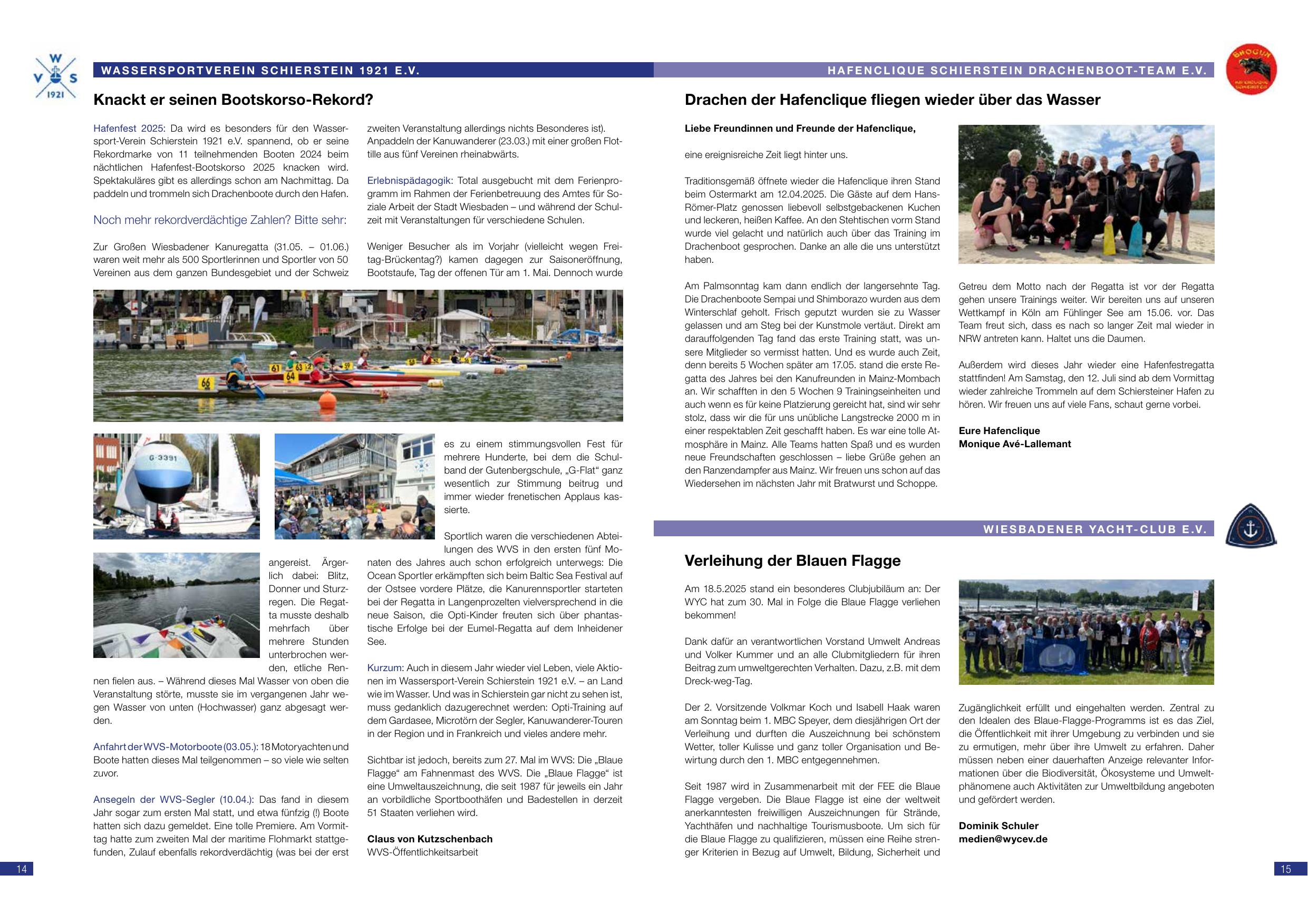 Knackt er seinen Bootskorso-Rekord? Der WSV berichtet, dass beim Hafenfest 2025 besonders für den Wassersport Schierstein, der ob bei 11 teilnehmenden Booten (2024) beim Korso einen neuen Rekord aufgestellt hat, wiederum Spannendes erwartet werden kann. Frühere Jahre hatten bereits bis zu 31 Booten beim Korso. Im Großen Wiesbadener Kanuregattta (01.06.–01.06.) waren mehr als 400 Teilnehmende aus den Vereinen anwesend, mit guten Ergebnissen. Zweiter Veranstaltungshinweis: Der Eröffnungsabend des Hafenfestes findet am Freitag, 11. Juli, statt. Claus von Kutschenbach.