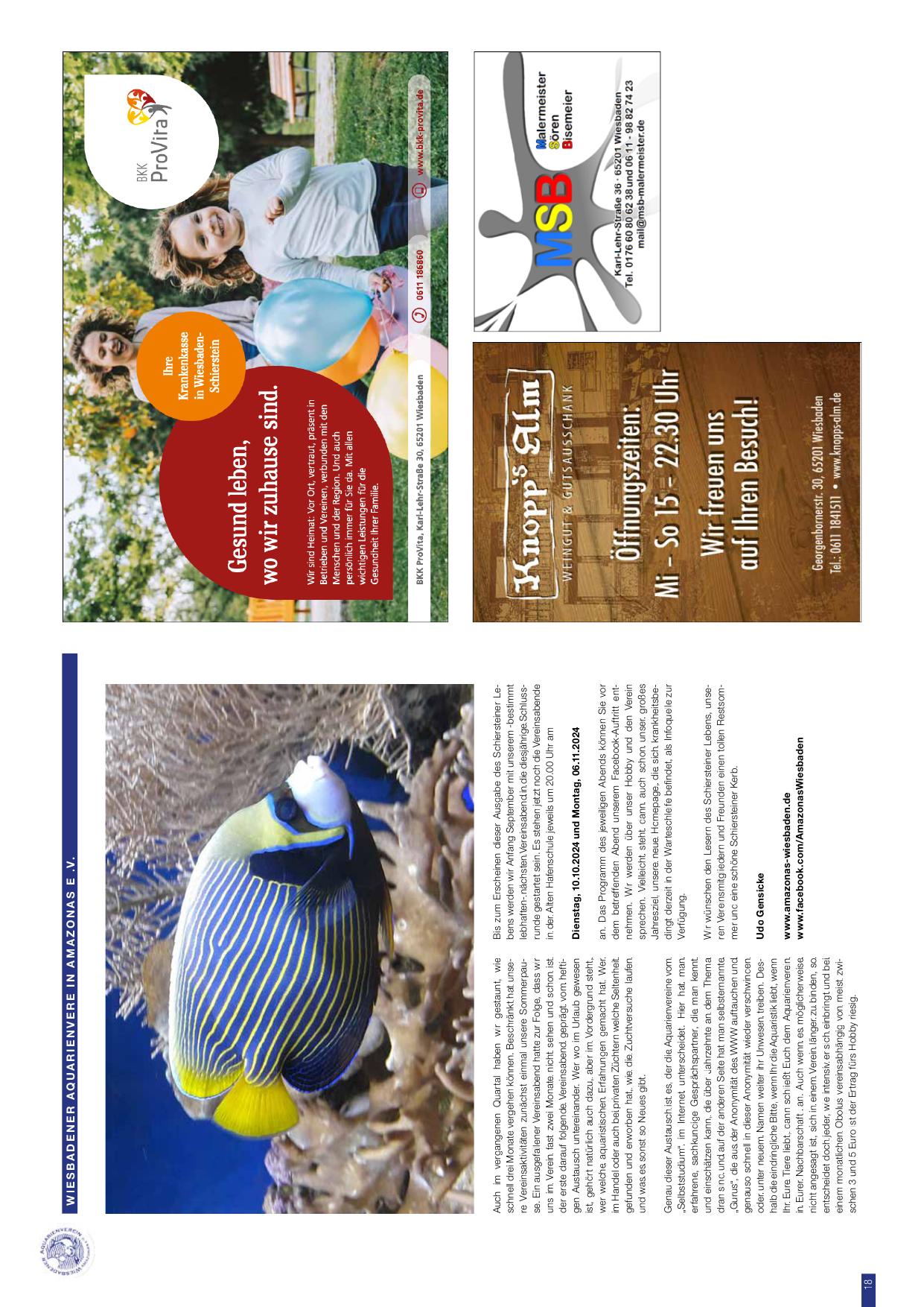 Der Wiesbadener Aquarienverein Amazonas e.V. berichtet: Im vergangenen Quartal haben wir gestaunt, wie faszinierend die Mitglieder des Wiesbadener Aquarienverein Amazonas die Schönheit der vielfältigen Meeresbewohner für sich entdecken. Beispielsweise zeigt hier auch dieser Kaiserfisch aus dem Indopazifik seine wunderschönen Farben. Und auch die Aquarianer können Ihre Zeit im Verein nutzen. Viele neue Möglichkeiten stehen hier zu verfügung. Zum Einschreiben dieser Ausgabe des Schiersteiner Lebens wird berichtet, dass wir an Beginn September mit unserem Halbjahrestreff nochmals um 20:00 Uhr in die Alte Hafenschule gewählt haben. Das Programm des Abends wurde den Teilnehmern via Facebook-Kanal rechtzeitig mitgeteilt. Dienstag, 10.10.2024 und Montag, 06.11.2024 finden weitere Treffen statt. Wir freuen uns auf den Schiersteiner Lesern des Schiersteiner Lebens, unsere Freundschaft zu stärken und zu pflegen. Udó Genecke. www.facebook.com/AmazonasWiesbaden.