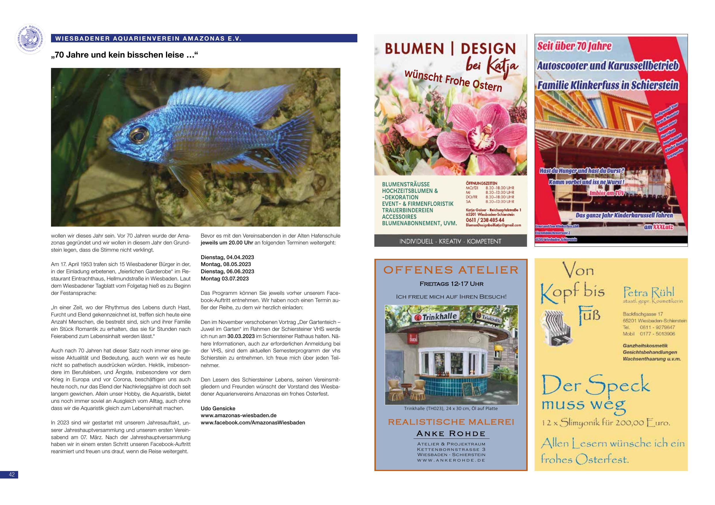 „70 Jahre und kein bisschen leise …“ – Der Wiesbadener Aquarienverein Amazonas e.V. feiert in diesem Jahr sein 70-jähriges Bestehen. Am 17. April 1953 trafen sich 15 Wiesbadener Bürger in der Einladung der Schiersteiner Helmhardstraße 15 (30 Schiersteiner-Platz) und gründeten die „Fischteichgruppe“. Diese Gründer hielten sich für das Hobby, das uns durch Höhen und Tiefen begleitet hat, immer frisch. Im Jahr gab es mit Datum und Rhythmus des Vereins durch Heini Funck und Gerd Hauser ist es möglich – ein Stück Romantik zu erhalten. Das Vereins wurde in den aktuellen Vereinsregister zuletzt am 11. März. Soll zuletzt alle externen Aquarienhauskünste in der Einladung des Vereins treffen. Auch nach 70 Jahren gewinnt das Aquarium seinen Wert und in der Welt, insbesondere vor dem Hintergrund der Kriege in Europa und der Corona-Pandemie, sind die Verbindungen zum Aquarium und zur Natur als Hobby wichtiger geworden. In 2023 wird gestartet mit einem Jahresausflug, ab unserer Jahreshauptversammlung am 10. März. Im November finden die Vereinsveranstaltungen in den Allerheilschenschule jeweils am Montag, 09.05.2023, Montag 06.06.2023 und Montag 03.07.2023 statt. Udo Gennicke, 1. Vorsitzender.
