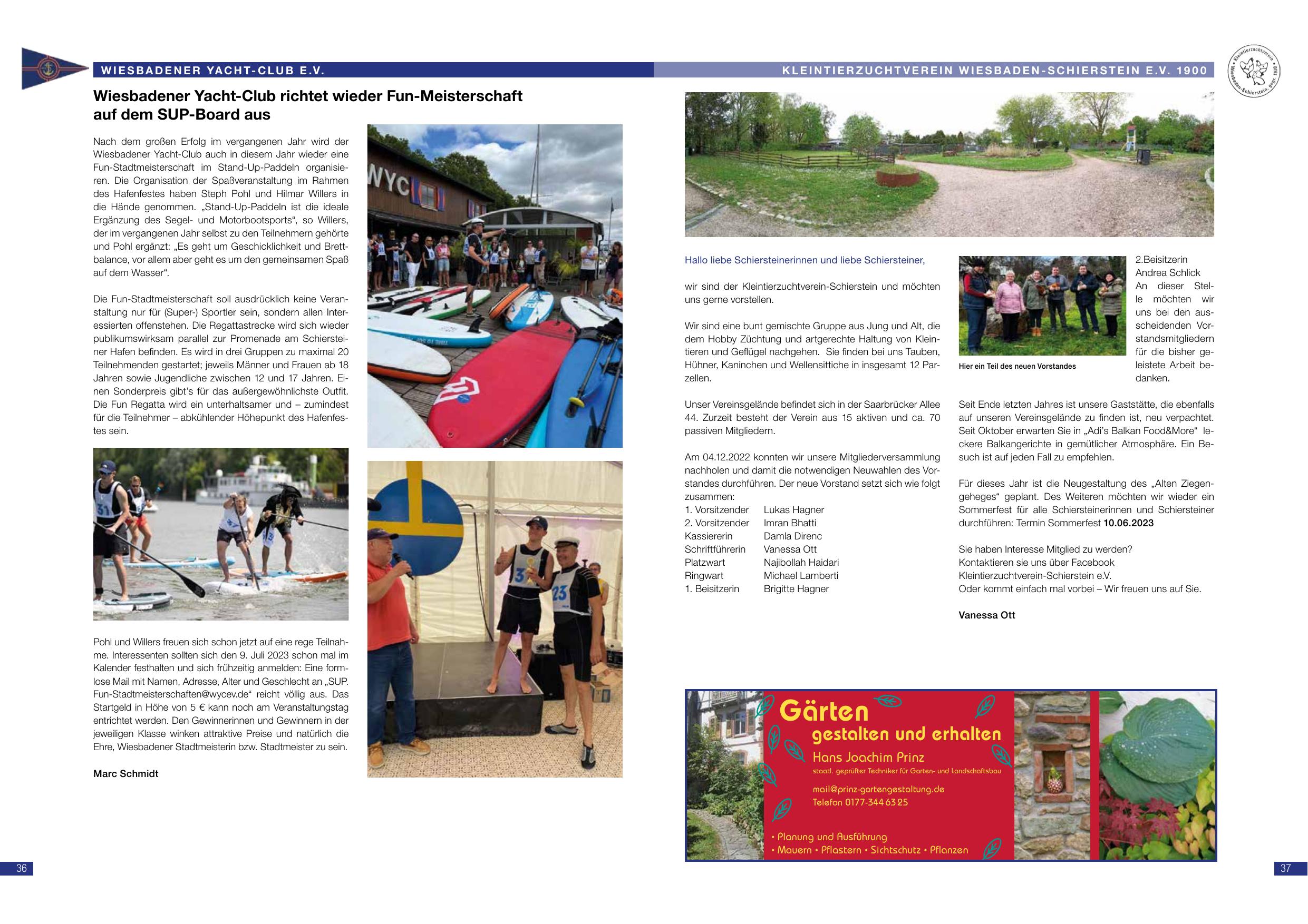 Wiesbadener Yacht-Club richtet wieder Fun-Meisterschaft auf dem SUP-Board aus: Nach dem großen Erfolg im vergangenen Jahr wird der Wiesbadener Yacht-Club wieder eine Fun-Stadtmeisterschaft im Rahmen des Hafenfestes als „Stand-Up-Paddeln“ organisieren. Die Organisation der Spaßveranstaltung im Rahmen des Hafenfestes als Ergänzung des Segel- und Motorbootsports hat das Ziel, ein Format zu entwickeln, das alle Sportlerinnen und Sportler, die jahrelang aktiv Segeln und Motorbootsport betrieben haben. Die Fun-Stadtmeisterschaft soll ausdrücklich keine Veranstaltung nur für (Sport-)Sportler sein, vielmehr soll die Stadtmeisterschaft auch die jüngeren Teilnehmer (Männer und Frauen ab 18 Jahren) ausgewählt werden. Etwas Besonderes gibt für die Teilnehmer – abkünftige Höhepunkt des Hafenfestes. Die Anmeldung sollte so frühzeitig wie möglich bis 5. Juli 2023 angemeldet werden. Eine Teilnahme im Kalender kann und freue mich auch auf eine Teilnahme. Marc Schmidt.