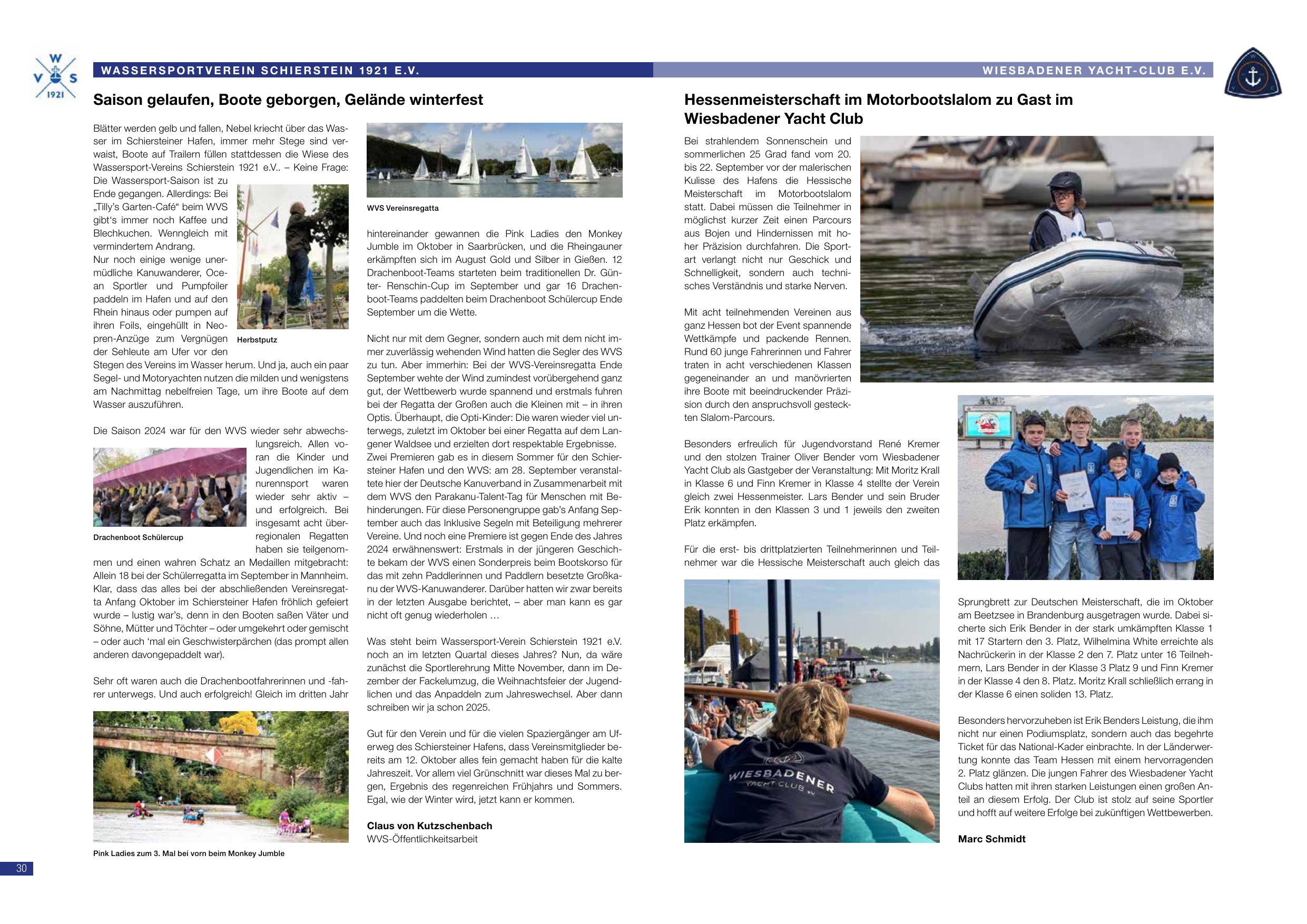 Hessenmeisterschaft im Motorbootslalom zu Gast im Wiesbadener Yacht Club: Bei den alljährlichen Hessischen Motorbootslalom-Rennen, einem ca. 20 Grad langen Slalomkurs des Hallenbades der Hessische Motorbootslalom-Vereins, traten diesmal alle Vereine ihren Slalom ab. Zum allerersten Mal waren Schüler und Jugendliche aus der Landesveranstaltung angetreten. Mit dem lebhaften Trainern Oliver Kramer (Klasse M1 22 bis 5 Jahren) und seinem Trainer Oliver Schmidt aus Wiesbaden konnten sie die vielen Jungen Teilnehmer und alle begeistert ankämpfen: Er stellte in Klasse 6 Platz 1 und einem zweiten Trainingsplatz auf Klasse 4 den Sieger und 1. Platz in der Schlussveranstaltung. Marco Schmidt.